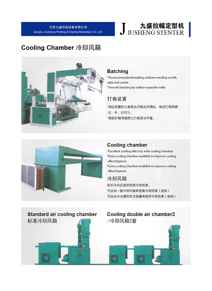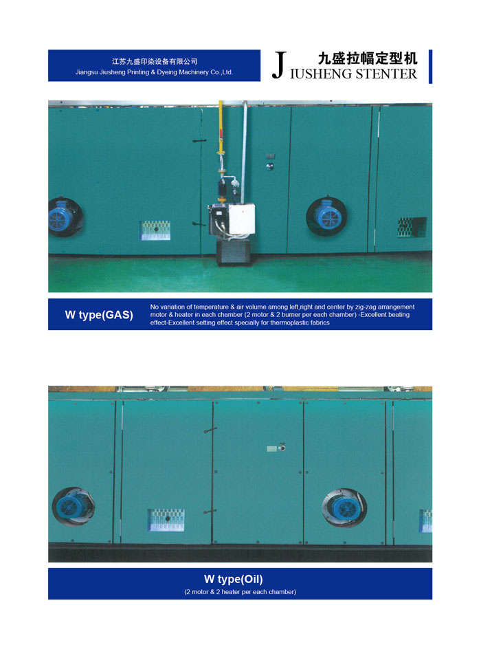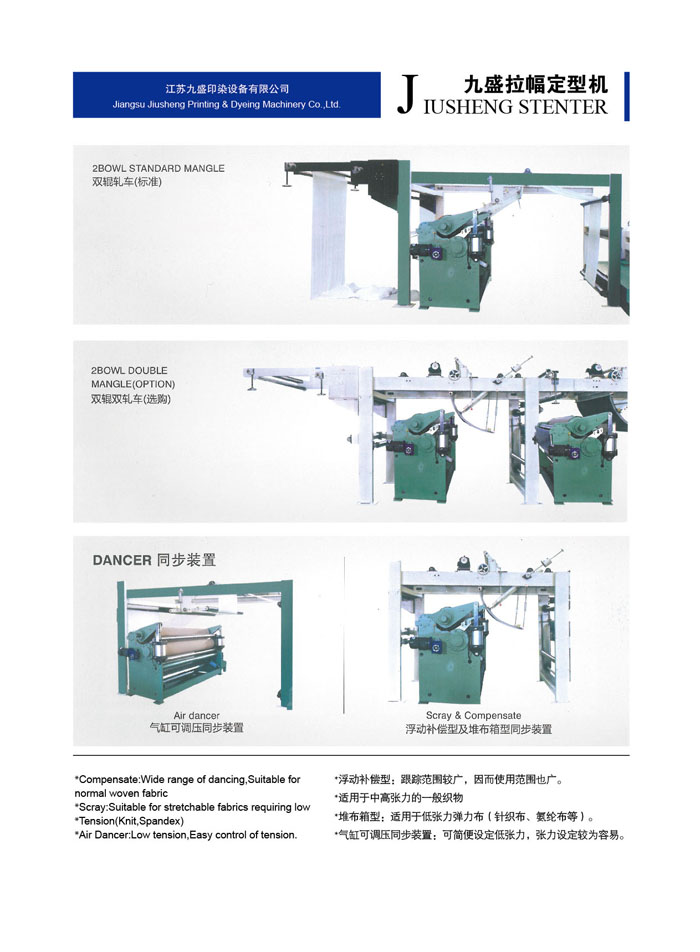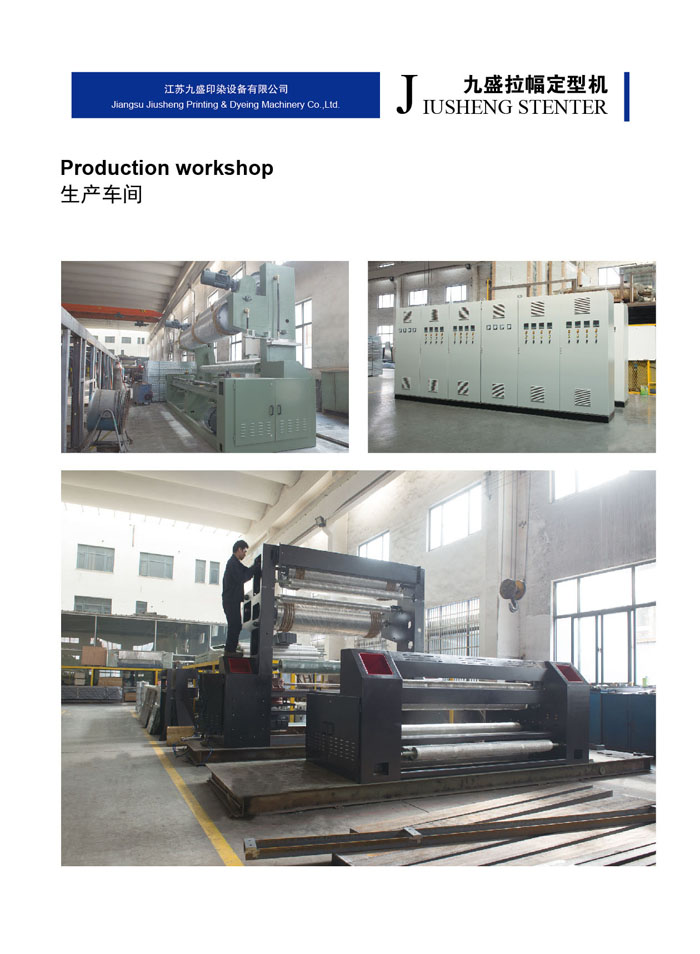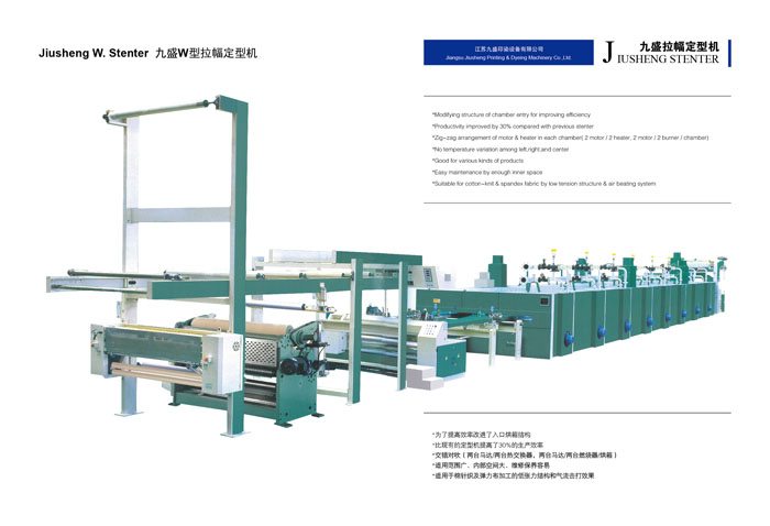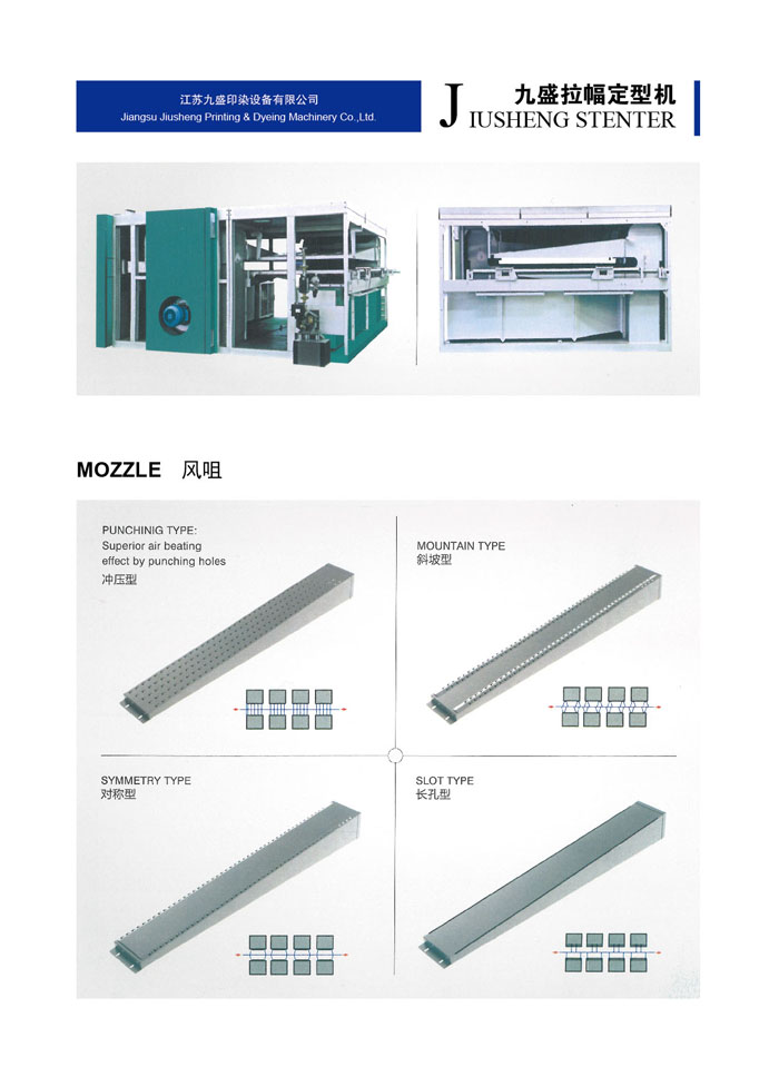 江蘇九盛印染設(shè)備有限公司(原江蘇鵬輝印染機(jī)械有限公司)創(chuàng)建于1986年,北長江,所在地區(qū)內(nèi)鐵路、高等級公路縱橫成網(wǎng),常州長江公路大橋飛架大江南北,水陸交通十分便利。公司有近二十年的熱定型機(jī)設(shè)計、生產(chǎn)經(jīng)驗、有批從事新型熱定機(jī)開發(fā)、設(shè)計的專業(yè)人才,具有豐富生產(chǎn)和制作經(jīng)驗的技師和技工。已成為國內(nèi)頗具名聲的機(jī)械制作企業(yè)。 樹脂定型是染整工程最后的程序,因此定型機(jī)的設(shè)計及操作技術(shù)成為決定織物品質(zhì)重要的一環(huán),九盛公司多年的經(jīng)驗改良完成新生代定型機(jī),針對業(yè)者需要對于節(jié)省人力布匹張力的減少、緯紗的調(diào)整,風(fēng)量的調(diào)節(jié),布邊控制及切邊損耗及至于熱能保持,維修工作,操作管理都有卓越表現(xiàn)及實際成果,而機(jī)械的研制及生產(chǎn)技術(shù)的發(fā)展是本公司創(chuàng)立的目標(biāo)和宗旨。