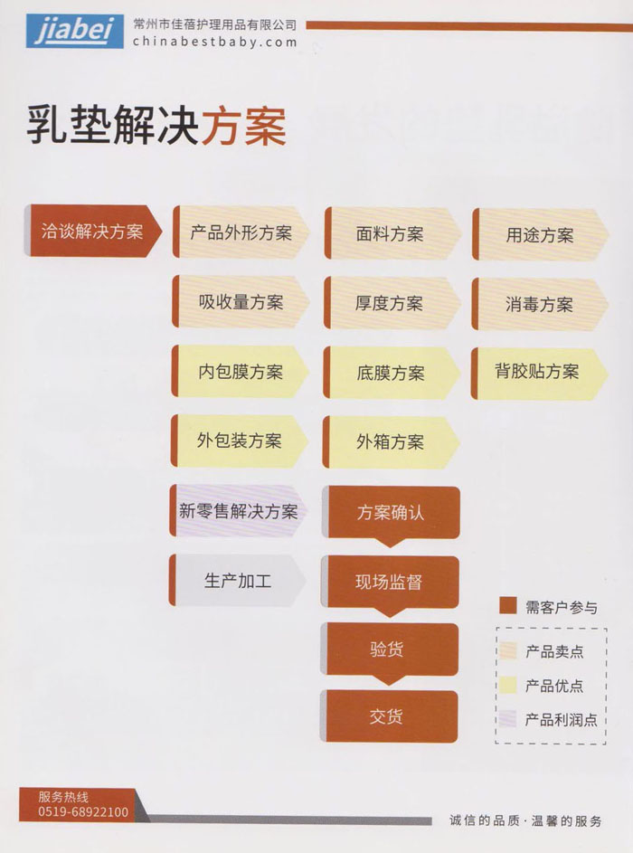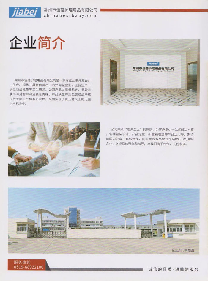 常州市佳蓓護理用品有限公司是一家專業(yè)從事開發(fā)、生產(chǎn)、銷售并具備自營出口的外向型企業(yè),主要生產(chǎn)“一次性防溢乳墊“,以質(zhì)量穩(wěn)定,柔軟親膚而深受客戶和消費者青睞。本公司產(chǎn)品從生產(chǎn)到包裝成品嚴(yán)格執(zhí)行無菌生產(chǎn)標(biāo)準(zhǔn)化流程,并和設(shè)備生產(chǎn)廠家合作開發(fā)了兩條從進料、生產(chǎn)、檢測、滅菌、成品包裝的無菌生產(chǎn)線,從而實現(xiàn)了真正意義上的無菌生產(chǎn)標(biāo)準(zhǔn)化。 佳蓓秉承”用戶至上“的原則,期待與國內(nèi)外客戶真誠合作,同時也誠邀品牌公司貼牌合作,歡迎您的蒞臨和指導(dǎo),與我們攜手合作,共創(chuàng)未來。
