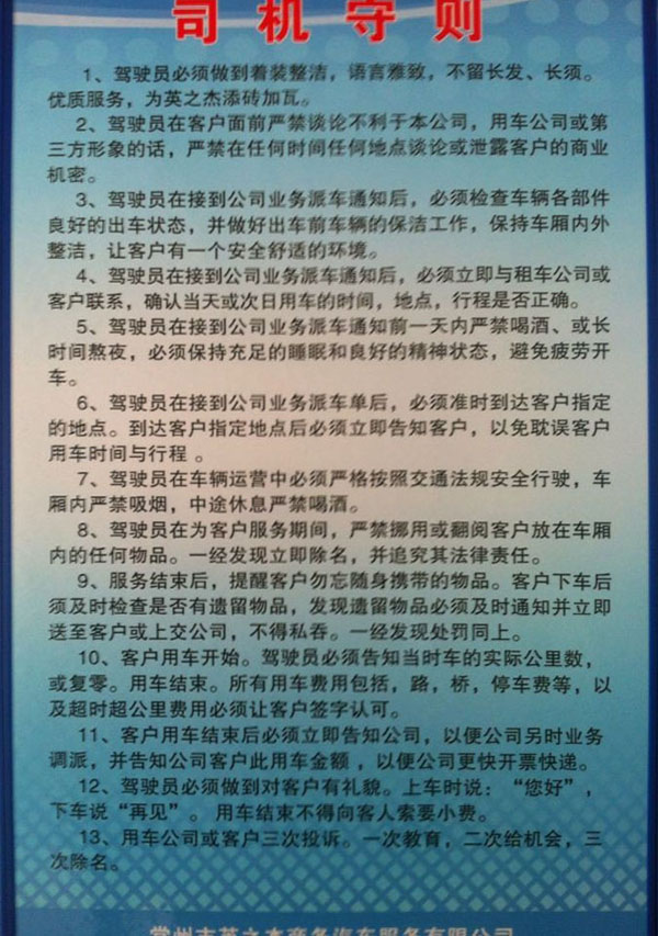 常州市英之杰商務(wù)汽車服務(wù)有限公司是一家專業(yè)從事企事業(yè)單位重要接待任務(wù)、企業(yè)高檔旅游等用車服務(wù)、以及中、小型高檔汽車的租賃業(yè)務(wù)。具有省交通廳批準(zhǔn)核發(fā)的客運企業(yè)資質(zhì)證書。多年來,本公司從行業(yè)管理要求出發(fā),結(jié)合本公司的實際情況,堅持“親和、誠信、專業(yè)、便捷”的服務(wù)品牌內(nèi)涵,注重團(tuán)隊建設(shè)、車輛管理、安全管理和優(yōu)質(zhì)服務(wù)等,進(jìn)一步提升本公司在我市客運行業(yè)中的良好形象。本公司著重在服務(wù)、安全管理上下功夫,從經(jīng)營管理、服務(wù)理念上找差距:從提高適應(yīng)市場的能力上做文章。扎扎實實地抓好各項管理工作,做強而不盲目求大,做憂而不盲目求全,一切以客戶需求為需求。目前公司與常武地區(qū)的多家大型企事業(yè)單位和上市公司(如國茂減速機(jī)集團(tuán)、國泰鑄造集團(tuán)、騰龍汽車零部件股份有限公司、石墨烯研究院、海斯町發(fā)動機(jī)零部件有限公司等企事業(yè)單位)建立了良好的租車合作關(guān)系