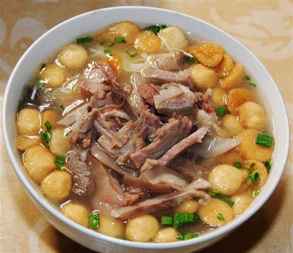 牟利英走進(jìn)廚房給客人盛羊湯,只見(jiàn)她在漏勺里放入百葉絲和豆炙餅,入鍋燙熟,倒入一只大碗,再倒入一碟羊雜碎,然后舀起一勺篤得奶白的羊骨頭湯,手腕一翻倒入碗里,熱騰騰、香噴噴的一碗羊湯就做好了,此時(shí)別忘了往湯里扔一小撮碧綠生青的蒜葉提香。趁熱喝,從嘴里一直熱到胃里,就連整個(gè)人似乎也跟著暖熱了起來(lái)。談旭東在一邊說(shuō),他小時(shí)候,羊肉館里用的豆炙餅還是自家熯的(熯,音同“漢”,意為焙或用極少的油煎),現(xiàn)在雖說(shuō)是別人供貨的,但也算是特制的,要關(guān)照多熯一會(huì)兒,這樣才不會(huì)一下鍋就篤爛,拿回家后,他還要再用油爆香,放在湯里才更好吃。