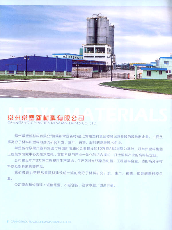 常州常塑新材料有限公司(原名常州塑料集團新材料有限公司)是一家民營股份制企業(yè)。主要從事高分子材料和塑料助劑的研究開發(fā)、生產(chǎn)、銷售、服務。 常塑新材料以常州塑料集團與韓國新湖油化合資建設的10萬噸ABS樹脂為基礎,和與德國吉瑪公司合資建設的20萬噸PET樹脂。以常州塑料集團工程技術研究中心為技術依托,實現(xiàn)科研與產(chǎn)業(yè)一體化的組合模式。 公司建設年產(chǎn)3萬噸工程塑料生產(chǎn)基地,生產(chǎn)各種阻燃ABS、耐熱ABS樹脂、工程塑料合金、功能高分子材料以及塑料助劑等產(chǎn)品。 公司目標:把常塑新材料建設成一流的高分子材料研究開發(fā)、生產(chǎn)、銷售、服務的高科技企業(yè)。 公司理念和價值觀:誠信經(jīng)營、不斷創(chuàng)新、追求卓越、創(chuàng)造價值。 公司旨在創(chuàng)造以人為本不斷創(chuàng)新的企業(yè)可持續(xù)發(fā)展的核心競爭力,為社會創(chuàng)造價值。