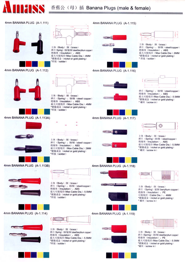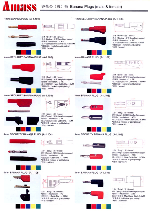 本公司專業(yè)生產(chǎn)各類香蕉插頭,香蕉插座,接線柱,電瓶夾,鱷魚夾,測試導(dǎo)線,測試筆等。產(chǎn)品分2mm/2.5mm/3mm/3.5mm/4mm五大系列,百余種款式, 各種香蕉插廣泛用于儀器、儀表、電力測試、教學(xué)、玩具,視聽設(shè)備、醫(yī)療儀器,保健產(chǎn)品等領(lǐng)域。公司技術(shù)力量雄厚,生產(chǎn)工藝先進(jìn),產(chǎn)品遠(yuǎn)銷港、臺(tái)、歐美,并與飛利浦等國際品牌配套。公司本著精益求精的理念,歡迎新老客戶光臨。