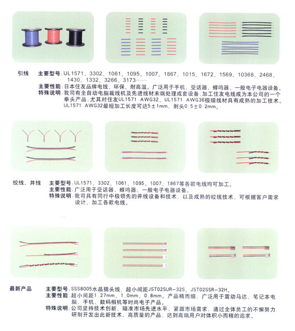 常州市匯創(chuàng)電子有限公司我公司2000年8月成立.端子連接線生產(chǎn)有10余年的經(jīng)驗(yàn).結(jié)合韓國連接線生產(chǎn)技術(shù),致力于筆記本電腦,手機(jī),數(shù)碼相機(jī)等高端行業(yè)的小間距的端子連接線的研究和生產(chǎn).小間距端子連接線的插頭的常規(guī)型號有 SH/1.0mm, 51021-0200/1.25mm, ZH , PH, EH, XH, SAN, SCN, 2510 等.特殊插頭型號有:02SUR-32S,02SSR-32H.材料用原廠進(jìn)口的JST, MOLEX,或臺資廠家的(根據(jù)客戶需要).全環(huán)保,無鉛化生產(chǎn).2008年開始導(dǎo)入無鹵素要求。企業(yè)已經(jīng)通過ISO9001-2000質(zhì)量管理體系.質(zhì)量好!交貨快!價(jià)格合理!是目前常州AAC等多家大型受話器廠家的優(yōu)秀供應(yīng)商.客戶遍及常州周邊,蘇州,昆山,上海,深圳,嘉興,山東,重慶等地.也有直接出口韓國,臺灣.現(xiàn)有高素質(zhì)員工100人左右.廠房面積2000平方米.