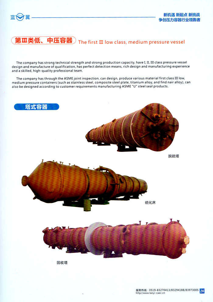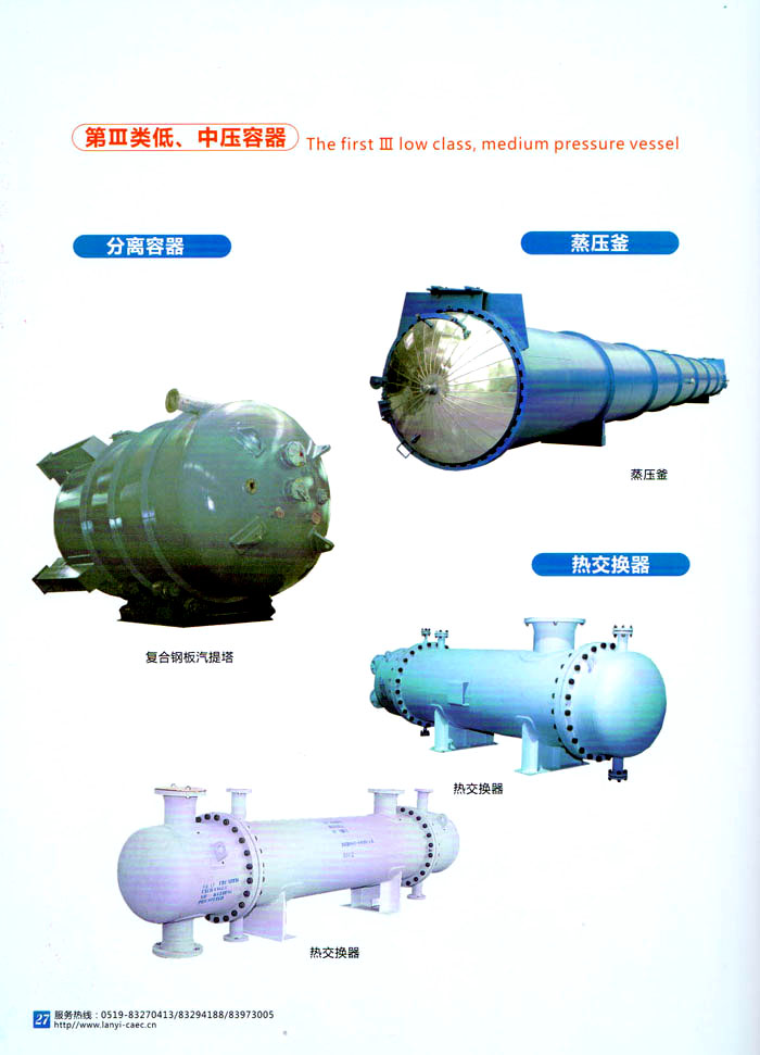 主要產(chǎn)品 中高壓航空滅火瓶、鋼質(zhì)焊接氣瓶、第三類低,中壓力容器、蒸壓釜、換熱器、民用核承壓設備、5至160立方米各類介質(zhì)貯罐、各種型號罐式集裝箱、生物工程設備、液化天然氣(LNG)車用氣瓶、液化天然氣(LNG)加氣站、乙炔工程設備、樹脂生產(chǎn)設備、核電工程設備、船舶專用設備等。
