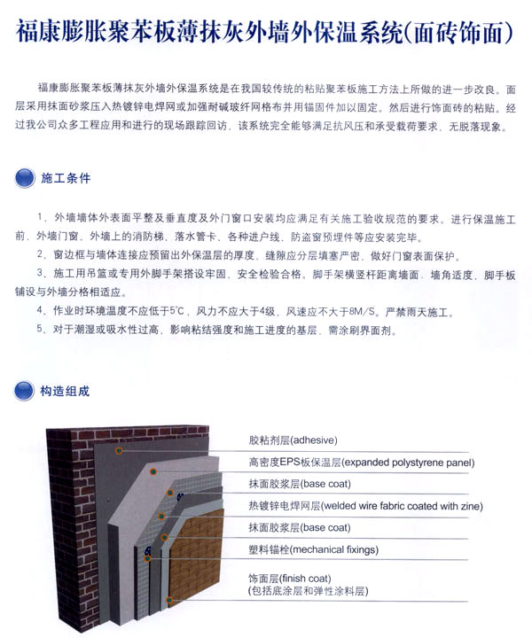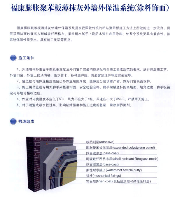常州市福康新型建材有限公司是以研制開發(fā)、生產(chǎn)、銷售、施工、技術(shù)服務(wù)為一體的化學(xué)建筑材料的專業(yè)企業(yè),通過與歐洲著 名建筑材料公司和國內(nèi)權(quán)威科研機構(gòu)合作,并聘請國家級專家為技術(shù)顧問,開發(fā)出適合我國市場的?礒PS、XPS及聚苯顆粒外墻外保溫節(jié)能系統(tǒng)。 公司的生產(chǎn)線全部采用國內(nèi)先進的電腦控制自動化設(shè)備,配備了專業(yè)的實驗中心,并且采用進口的可再分散乳膠粉為基料,確保?低鈮ν獗毓(jié)能系統(tǒng)具有性能優(yōu)異、安全可靠,綠色環(huán)保、適用性強的高品質(zhì)特點。 公司開發(fā)的\'福康外墻外保溫系統(tǒng)\'被列為江蘇省科技成果推廣項目。整個生產(chǎn)流程依照質(zhì)量體系的要求,實行嚴(yán)格的監(jiān)控和檢測,為生產(chǎn)優(yōu)質(zhì)產(chǎn)品提供保證。高品質(zhì)的?低鈮ν獗叵到y(tǒng),提供從熱工設(shè)計、產(chǎn)品開發(fā)、生產(chǎn)銷售及工程施工全程服務(wù)的一體化解決方案。 公司本著“綠色環(huán)保、節(jié)約能源、造福人類”的理念。用我們一流的產(chǎn)品和優(yōu)秀的服務(wù),打造出一個個節(jié)能康居示范工程,為人類營造出舒適健康的居住環(huán)境。我們愿為中國節(jié)能事業(yè)的發(fā)展積極努力,更上一層樓。 公司組建高效的生產(chǎn)經(jīng)營管理模式,設(shè)立專業(yè)技術(shù)服務(wù)機構(gòu)。配備售后的優(yōu)質(zhì)服務(wù)。實行原材料、運輸、安裝一條龍服務(wù)。經(jīng)本公司施工之后,貴公司可以直接批涂料、裝門窗、貼瓷磚,保證絕無任何質(zhì)量問題。
