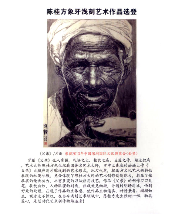 陳桂方,江蘇常州武進人,中國著名雕刻藝術家,江蘇省工藝美術大師、研究員級、高級工藝美術師,江蘇省非物質文化遺產《象牙淺刻》代表性傳承人。畢業(yè)于中國書畫函授大學,深造于清華大學、南大美術系,現(xiàn)任中國工藝美術協(xié)會會員,江蘇省工藝美術學會理事,常州市工藝美術家協(xié)會副秘書長,常州市工藝美術行業(yè)協(xié)會常務理事,武進工藝美術協(xié)會副主席。陳桂方大師淺刻作品的藝術特點:山水氣韻生動,氣勢磅礴,場面壯觀,刀法細膩:人物仕女生動可人,栩栩如生,充分表達體現(xiàn)了中國象牙工藝獨具的內在文化底蘊和現(xiàn)代社會的審美觀念及獨特的淺刻藝術表現(xiàn)技藝。對每件藝術作品創(chuàng)作都精益求精,強調藝術創(chuàng)作的思想性、意境及內涵。注重章法構思,掌握牙刻藝術的特性表現(xiàn),作品具有鮮明生動的時代氣息,獨具所創(chuàng)工筆與寫意相結合的牙刻藝術表現(xiàn)手法和表現(xiàn)形式,出眾、飄逸、多變的刀法技藝,粗獷處見細微、方寸間見大觀的創(chuàng)作理念深受專家權威的肯定和業(yè)內人士的一致好評。陳桂方大師至企頑事象牙淺刻藝術創(chuàng)作近四十余載,完善了自己的創(chuàng)作體系,成就了自己獨特的藝術風格。作品數(shù)年來連續(xù)二十多次榮獲國家最高藝術精品大獎《金獎》,象牙淺刻作品《李逵探母》已被國家工藝美術館收藏,并頒發(fā)了國家收藏證書,在全國數(shù)十年間尚屬首次。當前,陳桂方牙刻藝術作品已深受廣大海內外業(yè)內人士、收藏家們的鐘愛、青睞、熱藏,并被譽為當代最杰出最具潛質的實力派藝術大師。
