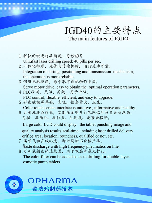 常州歐法瑪制藥技術(shù)有限公司位于長江三角洲黃金腹地——常州。地理位置優(yōu)越、交通便捷,由鐵路、公路、水路、民航形成了一張立體交叉的交通網(wǎng)絡(luò)。 公司創(chuàng)建于2013年,是一家集研發(fā)、生產(chǎn)和銷售為一體,專業(yè)從事高速激光打孔機(jī)、滲透泵制劑研發(fā)、生產(chǎn)和銷售。目前公司擁有員工20人,科技研發(fā)和技術(shù)人員占員工總數(shù)80%以上,其中本科以上學(xué)歷占80%以上。 公司始建以來,以前瞻的科學(xué)規(guī)劃,通過自主研發(fā),解決了高速激光打孔機(jī)諸多的世界難題,使之達(dá)到40片/秒以上且精確打孔的國際領(lǐng)先水平;同時開發(fā)廢片自動識別、剔除功能,以滿足客戶的實際所需。公司與瑞士等國家研究機(jī)構(gòu)的科技合作,以高速激光打孔機(jī)為基礎(chǔ),建設(shè)了滲透泵制劑研發(fā)和中試生產(chǎn)車間,開發(fā)了多種藥物的滲透泵制劑,形成了從關(guān)鍵設(shè)備研制,新制劑開發(fā)、工藝配套,到批量生產(chǎn)測試的滲透泵制劑開發(fā)全過程技術(shù)團(tuán)隊和研究設(shè)施。公司瞄準(zhǔn)現(xiàn)代新型釋藥系統(tǒng),吸收國內(nèi)外高端人才,努力開拓控緩釋技術(shù)、靶向給藥技術(shù)及智能給藥技術(shù)。 2013年公司被評為黑馬大賽“創(chuàng)業(yè)組50強(qiáng)”、“領(lǐng)軍人才創(chuàng)業(yè)重點企業(yè)”;2014公司通過了IS09001-2008質(zhì)量管理體系認(rèn)證、CE認(rèn)證、江蘇省質(zhì)量信得過企業(yè)。
