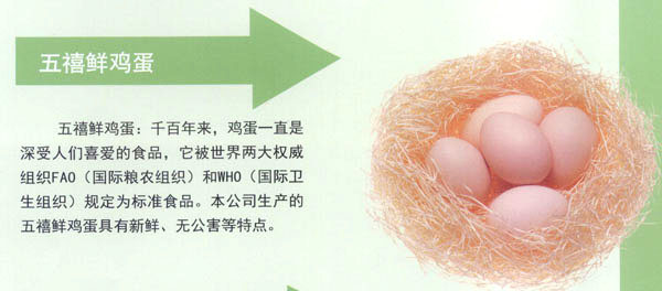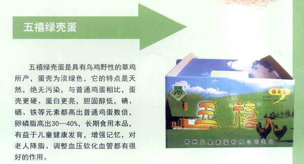 常州五星禽蛋有限公司創(chuàng)建于1990年,是常州市最大的禽蛋生產(chǎn)基地。公司秉承“辦實(shí)事、服務(wù)城市;上水平,掙創(chuàng)效益”的經(jīng)營宗旨。注重科技開發(fā)與管理創(chuàng)新,全力打造“五禧”品牌。公司于2000年通過了ISO9002質(zhì)量體系認(rèn)證;2004年又通過了無公害雞蛋產(chǎn)地和產(chǎn)品認(rèn)證,并獲兩項(xiàng)專利。 經(jīng)多年努力實(shí)現(xiàn)了“五禧”產(chǎn)品系列化,F(xiàn)公司每年向市場(chǎng)提供有“五禧”鮮雞蛋,“五禧”土雞蛋,“五禧”ELC蛋,“五禧”綠殼草雞蛋,成為了不同消費(fèi)群體的理想選擇!拔屐钡岸啻螛s獲常州市場(chǎng)知名商標(biāo)稱號(hào)。