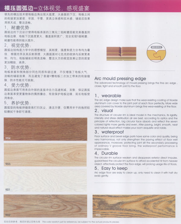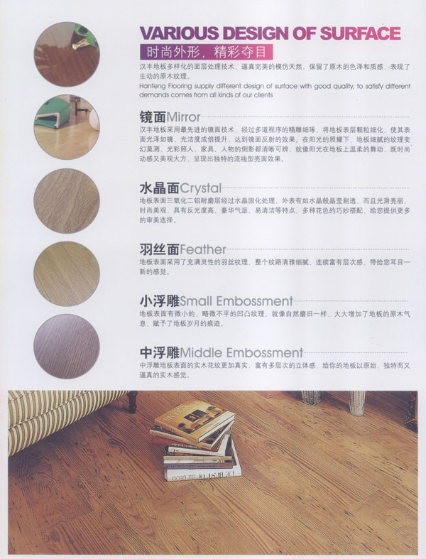 常州漢豐裝飾材料有限公司是一家涉及強化地板制造、屏風鋁材生產(chǎn)、進出口貿易的大型公司。2001年公司投入重資.全面引進世界頂級一體化自動流水生產(chǎn)線和具有國際先進水準的德國權威木地板生產(chǎn)技術,興建強化地板生產(chǎn)基地。多年以來.一直不斷加強生產(chǎn)設備、廠房基礎投入,目前公司年生產(chǎn)強化地板能力已經(jīng)達到了500萬平方米,步入國內一流行列,具備了雄厚的國際競爭力。 漢豐地板以奉獻生活中最完美的地板為發(fā)展目標,時尚流行的設計風格和多樣化的產(chǎn)品類型,贏得了市場的廣泛贊譽和肯定。產(chǎn)品嚴格按照歐洲標準檢測強化木地板的各項性能指標.達到百分百的國際技術標準,確保了每一塊地板都有著上乘品質,是綠色環(huán)保的好地板。并先后通過了Isc)9001國際質量管理體系認證,IS014001國際環(huán)境管理體系認證.中國環(huán)境標志產(chǎn)品認證,深得用戶的一致好評,是寫字樓、商場、大型超市、學校、建筑樓宇、娛樂場所、家用私宅等鋪裝的首選地板。