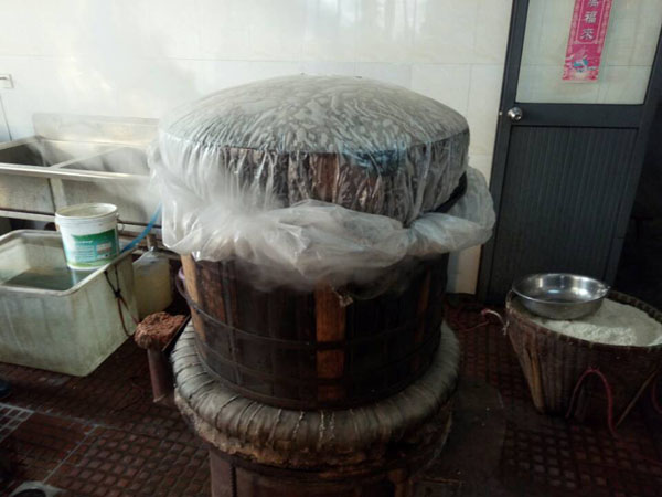 第一步:蒸糯米飯,老徐先用煤爐將水燒開(kāi),再將洗凈泡好的糯米放入一只大木桶中,放在爐子上蒸。除此以外,老徐還要不斷攪拌,保證糯米受熱均勻,直至散發(fā)出水蒸氣。為了保證米飯溫度,老徐特地用塑料薄膜將木桶封住,并用皮筋加固。蒸糯米飯,大約需要半個(gè)多小時(shí)。