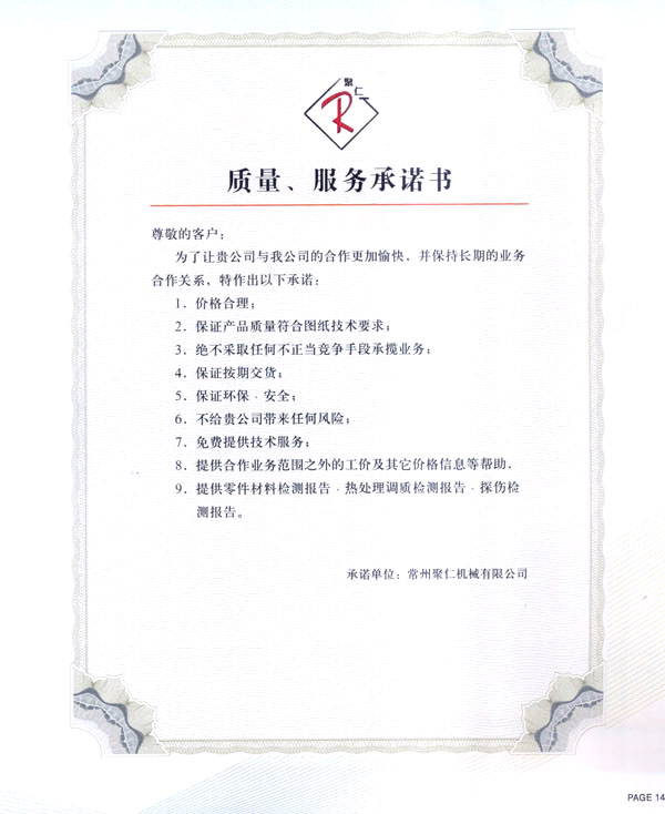聚仁重效率更重質(zhì)量;在聚仁,寧缺毋濫的精品意識是每個員工的責任,制造精良產(chǎn)品是每個員工永遠的追求。聚仁立求做到要效率,更要質(zhì)量,除了品質(zhì)一流的產(chǎn)品外,其它產(chǎn)品絕不交付客戶。聚仁重現(xiàn)場更重市場:市場決定現(xiàn)場,現(xiàn)場連著市場,現(xiàn)場為市場服務(wù),在搞好現(xiàn)場管理的同時,實現(xiàn)與市場和客戶的雙贏。聚仁對客戶的承諾是:不合格的材料不進廠,不合格的半成品不轉(zhuǎn)序,不合格的產(chǎn)品不交付,以百分之百的合格品交付客戶。