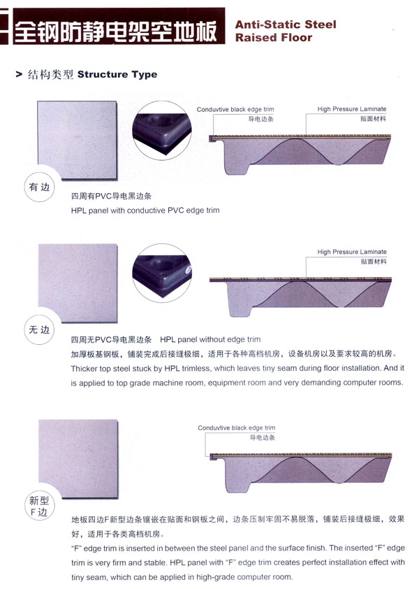 常州市蘇杰機(jī)房地板有限公司是高架地板專業(yè)制造商,專業(yè)從事防靜電地板、OA網(wǎng)絡(luò)地板等各種系列高架地板的研發(fā)、制造和銷售,并提供各種機(jī)房地面和智能化辦公區(qū)地面的整體解決方案。 公司廠區(qū)面積30000平方米,擁有全鋼地板生產(chǎn)線兩條,木基、硫酸鈣基地板生產(chǎn)線各一條,年綜合產(chǎn)能100萬平方米。生產(chǎn)蘇杰牌防靜電地板系列和蘇杰牌網(wǎng)絡(luò)地板系列,主要產(chǎn)品有全鋼防靜電架空地板、全鋼OA網(wǎng)絡(luò)地板、瓷磚貼面防靜電地板、硫酸鈣防靜電地板、木基防靜電地板、鋁合金防靜電地板、防靜電通風(fēng)地板等。 蘇杰人秉承“科技先導(dǎo)、市場為本、持續(xù)發(fā)展”的企業(yè)發(fā)展觀,堅(jiān)持“以先進(jìn)技術(shù)裝備為基礎(chǔ),以現(xiàn)代化管理為依托,以專業(yè)化服務(wù)為保障”的宗旨,使公司不斷發(fā)展壯大成為現(xiàn)代化的企業(yè)。 蘇杰人堅(jiān)持“嚴(yán)謹(jǐn)思考、嚴(yán)密操作、嚴(yán)格檢查、嚴(yán)肅驗(yàn)證”的品質(zhì)理念和“以客戶為中心”的服務(wù)理念,始終致力于產(chǎn)品的技術(shù)創(chuàng)新和質(zhì)量創(chuàng)優(yōu),為用戶提供優(yōu)質(zhì)的產(chǎn)品、合理的價(jià)格和貼心的服務(wù)。 常州市蘇杰機(jī)房地板有限公司將不斷開發(fā)和制造一流的產(chǎn)品,吸引和培養(yǎng)一流的人才,提供和完善一流的服務(wù),樹立和保持一流的形象,與時(shí)俱進(jìn),共謀發(fā)展。