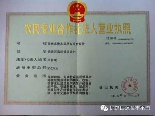 合作社生產(chǎn)的水蜜桃、葡萄在2013年通過國家綠色食品認證, 2013年合作社生產(chǎn)的“常聚”牌湖景水蜜桃在江蘇省第六屆“神農(nóng)杯”優(yōu)質(zhì)水果評比中獲得了銀獎。2012年合作社被常州市工商局和常州市經(jīng)紀人協(xié)會評為“常州市優(yōu)秀經(jīng)紀人”。合作社與農(nóng)業(yè)部南京農(nóng)業(yè)機械研究所、江蘇省農(nóng)科院、93學(xué)社等多家科研學(xué)術(shù)單位建立有緊密技術(shù)協(xié)作關(guān)系。合作社創(chuàng)新理念強,果品生產(chǎn)起點高,帶動范圍廣,運作規(guī)范,經(jīng)濟實力較強,擁有豐富的新品種引進、開發(fā)實踐經(jīng)驗。