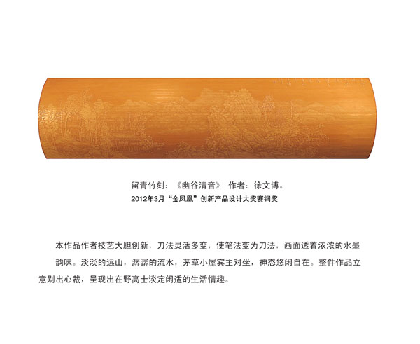 徐博(藝名文博),1973年生,江蘇武進(jìn)人,江蘇省省名人,高級(jí)工藝美術(shù)師,常州市留青竹刻非遺傳承人,常州工藝美術(shù)家協(xié)會(huì)理事,被譽(yù)為當(dāng)今中國(guó)最具創(chuàng)新意識(shí)的新銳竹刻家代表,多次獲得國(guó)家工藝美術(shù)大獎(jiǎng)?釔哿羟嘀窨痰男煳牟┵p竹為樂(lè),以竹詠志,借竹抒懷,悉心探索留青竹刻的藝術(shù)表現(xiàn)。在中國(guó)工藝美術(shù)大師蕭劍波的精心指導(dǎo)下,開創(chuàng)留青水墨山水之技法,更好的體現(xiàn)了竹刻淡雅清秀的藝術(shù)風(fēng)格,并不斷汲取書畫、攝影、雕塑等藝術(shù)精華,不斷滋養(yǎng)藝術(shù)情趣,提升擴(kuò)展胸襟人格的同時(shí)也逐步形成了其形神兼?zhèn),虛?shí)相生,氣韻生動(dòng)的藝術(shù)特點(diǎn),作品為眾多的國(guó)內(nèi)外收藏家珍藏。