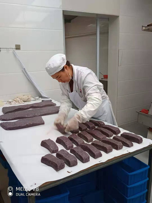 腳踏糕本名“年糕”,按常州周邊地區(qū)的風(fēng)俗習(xí)慣,在春季前夕,各家各戶都要蒸年糕,吃年糕。“糕”諧音“高”,過年吃年糕被賜予“年年高”,一年高一年,鋒吉祥之意,表達(dá)這人們對未來美好生活的憧憬和良好的祝愿。今天小編要帶大家的就是一家至今保持著傳統(tǒng)手工制作的鈺鋒糕點坊。 鈺鋒糕點坊位于常州鄭陸鎮(zhèn)三皇廟范家莊,一個比較偏僻的村莊,雖然這家作坊不大,但香糯絲滑,軟糯適中,韌勁十足的腳踏糕吸引了無數(shù)的食客。制作一條腳踏糕要從淘米,浸泡,碾粉,鋪粉,一層一層的鋪下去,需要無數(shù)道制作工序,這些都是店主孫煥公公老周,憑著幾十年的經(jīng)驗,加上店主孫煥從不馬虎的決心! 這“腳踏”也并非赤腳上陣,而是把蒸好的糕倒入早以準(zhǔn)備好的框子里,用布包裹好,上面再用薄膜包好,再蓋上布,再換上專門腳踏的布鞋,踩的時候要勻稱,左右腳要配合好,不然糕會高高低低,不平整,最后再拿蠟燭線拆成一條小長條,再拿帶包裝好,如此又香又糯的腳踏糕就大功告成了。 店主孫煥為了讓更多的人認(rèn)識和了解常州腳踏糕的傳統(tǒng)文化和美食,她在傳統(tǒng)工藝中增加了適合現(xiàn)代文化的多種口味,她在糕里加入南瓜,紫薯,老紅糖,大麥汁,血糯米,核桃,葡萄干,紅棗等食材,做出五顏六色,純天然的口味,深受食客們的喜愛,不管是送人還是自己吃都非常新穎。 (重陽糕)重陽糕的由來,九九重陽,九是陽數(shù),也是陽數(shù)中最大的數(shù),九月初九,兩九相重,為之重陽,古人有重陽登高的習(xí)俗。高于糕同意,寓意人活九十九,生活步步高,秋景勝春光,夕陽無限好。夕陽紅成了老人對自己美好的祝愿和希望,所以從某種意義上來講它“祝壽糕”“長壽糕”重陽糕在常州地區(qū)是家喻戶曉的,下面小編帶你去一家至今保持傳統(tǒng)手工制作的鈺鋒糕點坊看一下吧。鈺鋒糕點坊位于常州市天寧區(qū)鄭陸鎮(zhèn)三皇廟范家莊,偏僻的小村莊,雖然有點偏僻,但是每到重陽節(jié)到來,每天還是有很多食客來訂購和購買店主孫煥做的多種口味的重陽糕。要想做出松軟香糯的重陽糕,原材料和糯米和梗米的配比也很重要,調(diào)整好比例開始淘米,浸泡,釓粉,放入糖攪拌,篩粉,糕底部放上荷葉,中間的餡心都是孫煥自己熬制,口感,香糯松軟,店主孫煥為了吸引更多現(xiàn)代年輕人,她在粉里加入南瓜,紫薯,紅糖,血糯等,色彩搭配很出跳,吸引來了很多食客,孫煥2019年開始自愿捐贈重陽糕給敬老院,她說這樣的公益活動自己很喜歡,雖然金額不大,缺表達(dá)了她的一份心意,并稱這樣的公益活動她每年都會做。