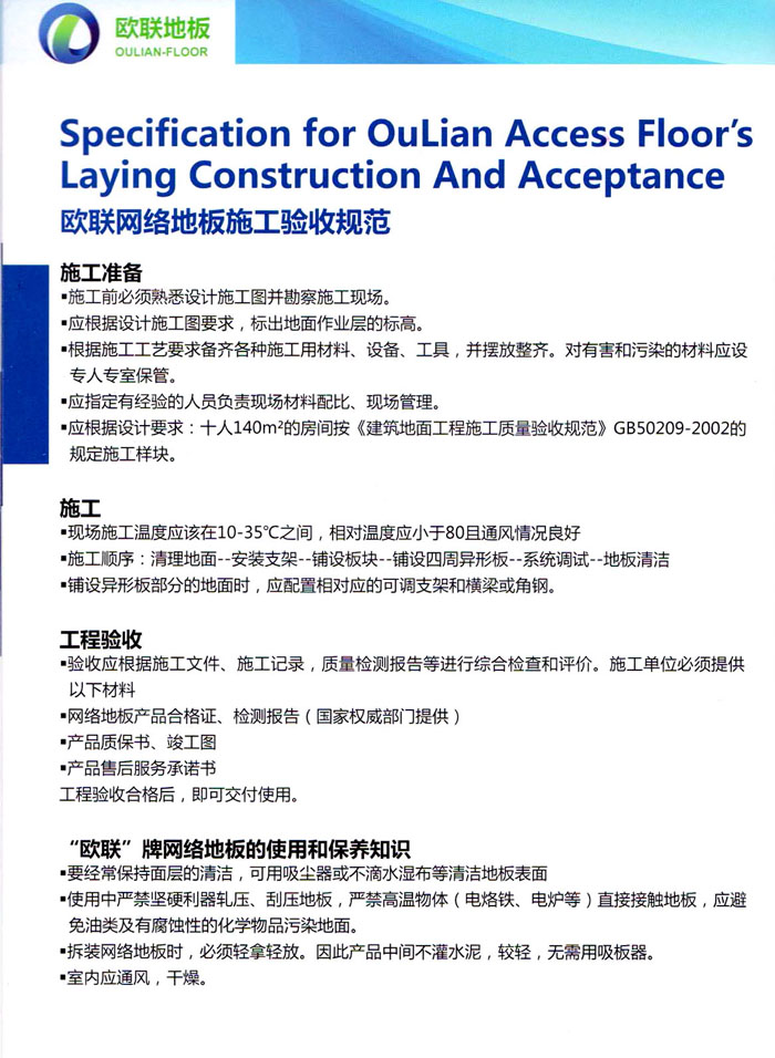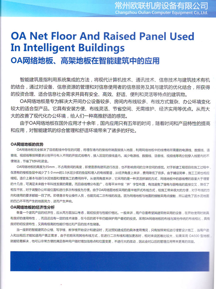 防靜電高架活動(dòng)地板、全鋼地板、陶瓷地板是計(jì)算機(jī)行業(yè)發(fā)展起來(lái)的新型鋪地材料,隔離了潮氣、靜電灰塵,最重要的是解決了綜合布線問題,無(wú)需預(yù)埋管線,可隨時(shí)拆卸、搬移,保證了資訊設(shè)備完整的優(yōu)點(diǎn),適應(yīng)了智能化樓宇中信息自動(dòng)化技術(shù)對(duì)所處環(huán)境的特定要求,避免了廣大客戶的雙重投資,使現(xiàn)代化辦公程度更加高效,辦公場(chǎng)所更加舒適。 “歐聯(lián)”系列全鋼地板,符合國(guó)家安全要求,種類完備多樣,其中防靜電陶瓷地板、硫酸鈣地板等除具有普通瓷質(zhì)的裝飾和實(shí)用性外,其耐磨、防水、防火功能優(yōu)于其它同類產(chǎn)品,防靜電系列地板,能切合不同客戶的要求,其靈活的配置,深受客戶歡迎,不同材質(zhì)的地板結(jié)構(gòu)使設(shè)計(jì)師的設(shè)計(jì)空間比傳統(tǒng)的更加廣闊自由和善變。 公司大力發(fā)展國(guó)內(nèi)外銷售業(yè)務(wù),多次中標(biāo)國(guó)內(nèi)重點(diǎn)工程 ,例:哈爾濱醫(yī)科大學(xué)、山東大學(xué)、上海普通機(jī)場(chǎng)等。 公司將一如既往開發(fā)和制造一流的產(chǎn)品,愿與廣大有識(shí)之士合作發(fā)展,共創(chuàng)美好未來(lái)。